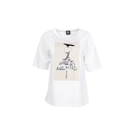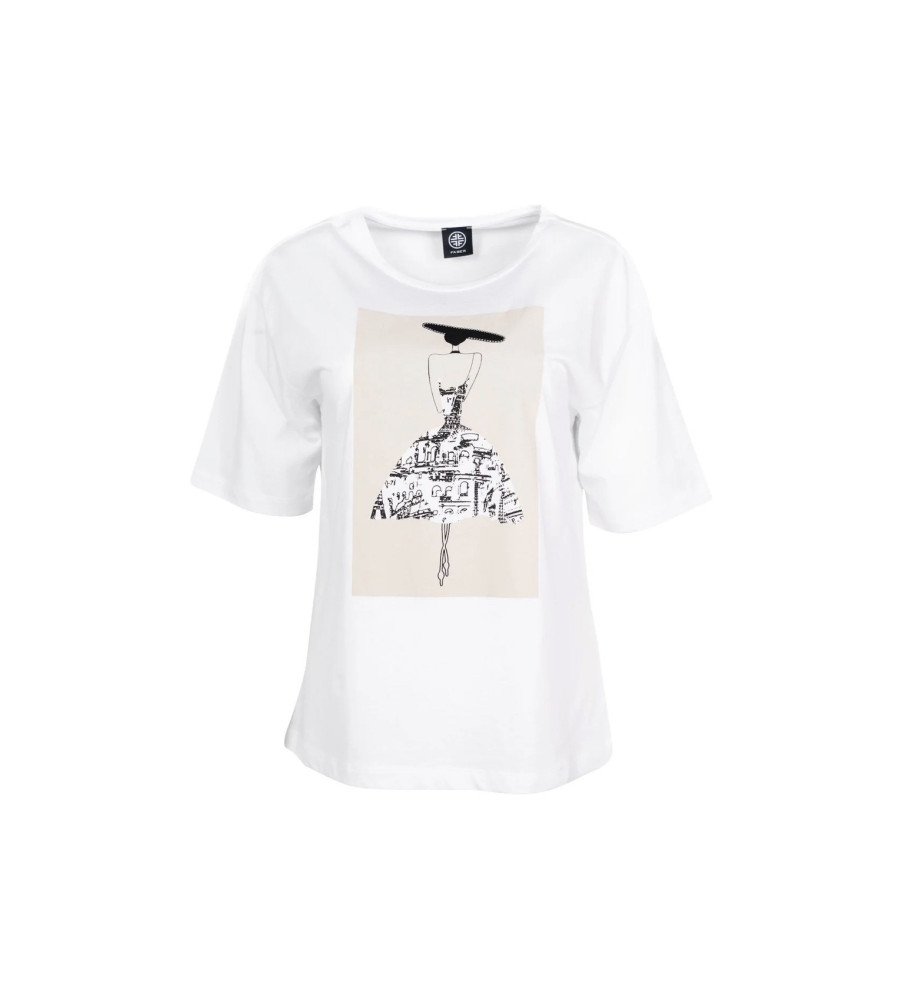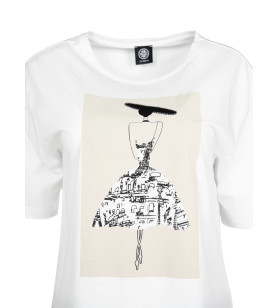Dámske tričko FABER zaujme originálnou umeleckou potlačou, ktorá spája módu a architektúru do jedinečného vizuálu. Minimalistická silueta postavy s klobúkom je doplnená grafickým motívom mesta, vďaka čomu pôsobí tričko moderne, štýlovo a nadčasovo. Voľnejší strih a príjemný materiál zaručujú komfort počas celého dňa. Tričko je ideálnou voľbou k nohaviciam, sukni aj džínsom. Pre ženy, ktoré majú rady módu s príbehom a umeleckým presahom. Zloženie: 100% bavlna.