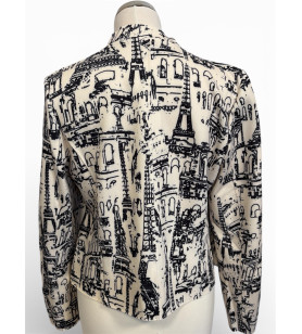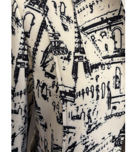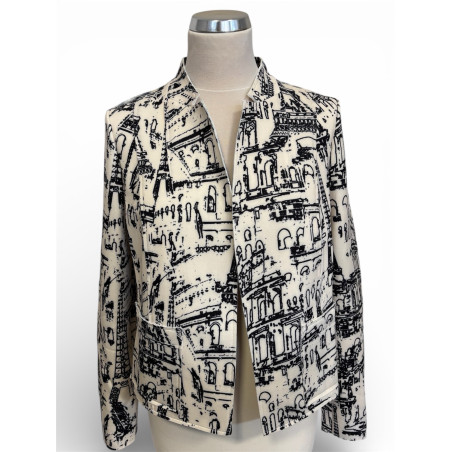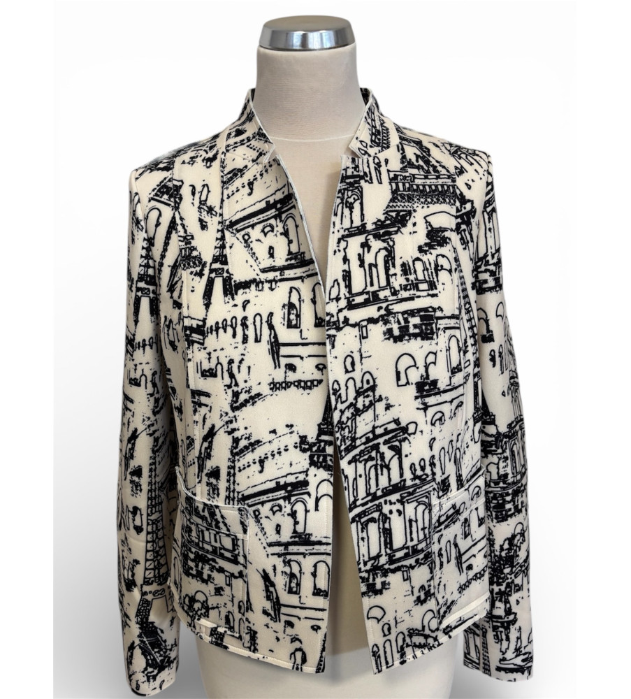 Dámsky blejzer FABER zaujme originálnou grafickou potlačou inšpirovanou architektúrou a mestskou atmosférou. Krémový základ v kontraste s čiernym vzorom vytvára výrazný, no stále nadčasový dizajn. Rovný, mierne kratší strih dodáva kúsku moderný vzhľad a umožňuje jednoduché kombinovanie s nohavicami, sukňou aj šatami. Blejzer je ideálny ako štýlový prechodný kúsok, ktorý dodá outfitu charakter a umelecký nádych. Vhodný na každodenné nosenie aj mestské príležitosti. Zloženie: 95% polyester a 5% elastán.