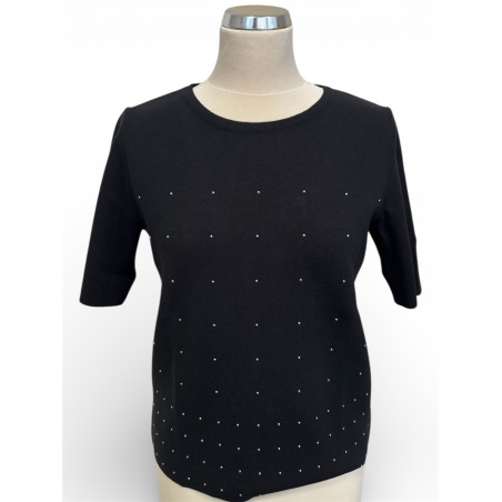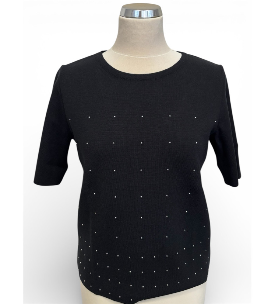 Dámsky pulóver FABER v čiernej farbe zaujme minimalistickým dizajnom doplneným o jemné bodkové zdobenie, ktoré dodáva kúsku elegantný a ženský charakter. Klasický okrúhly výstrih a čisté línie robia z tohto pulóvra nadčasový základ šatníka. Príjemný materiál a pohodlný strih zabezpečujú komfort počas celého dňa. Top je ideálny na kombinovanie s nohavicami, sukňou, aj pod sako či blejzer. Vhodný do práce, na stretnutia aj bežné nosenie. Zloženie: 69% viskóza, 29% akryl a 2% elastán.