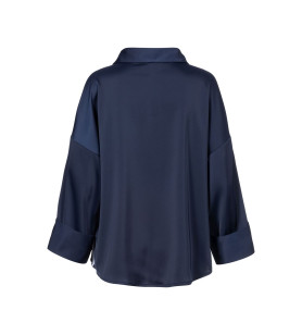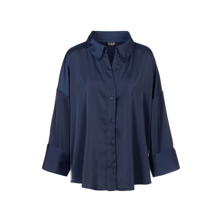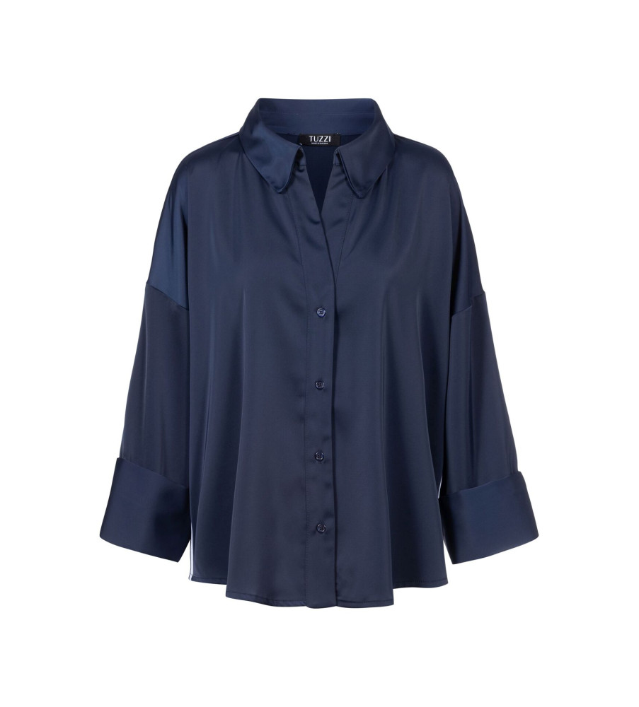 Elegantný tmavomodrý blejzer s kontrastnými bielymi pruhmi po bokoch je skvelým kúskom pre každý deň, keď chcete zvoliť voľnejší a pohodlný outfit. Príjemný splývavý materiál je doplnený o výrazné manžety na koncoch rukávov, dva biele pruhy po oboch bokoch blejzra a výraznejší golier. Zapínanie na gombíky je klasickým a praktickým riešením. Ideálna voľba pre biznis look s nohavicami či sukňou alebo ako vrchná vrstva na šaty.