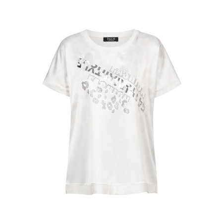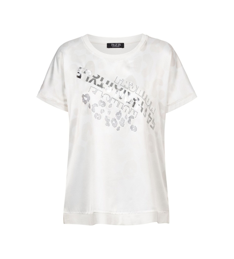 Elegantné tričko od značky TUZZI v neutrálnej bielo-krémovej farbe si vás získa na prvý pohľad. Jemný tón v tóne vzor dopĺňa výrazná aplikácia s nápisom a kamienkami, ktorá dodáva kúsku štýlový a moderný nádych. Príjemný, ľahký materiál zabezpečí komfort počas celého dňa, zatiaľ čo voľnejší strih krásne sadne na postavu a ľahko sa kombinuje s nohavicami aj sukňou. Zloženie: 100% polyester.