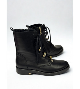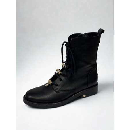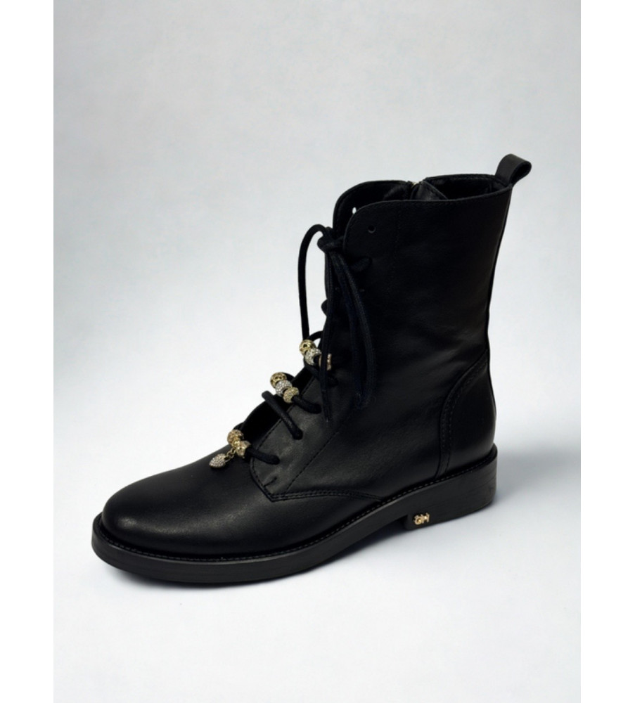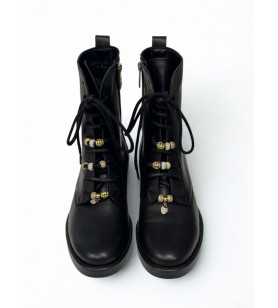 Čierne dámske čižmy značky Chebello spájajú pohodlie a štýl. Čižmy majú na vnútornej strane zips a viažu sa i na šnúrky, ktoré zdobia výrazné ozdobné korálky zlatej a striebornej farby. Čižmy majú mierne užší strih. V mäkkej koži sú pre Vás tou správnou voľbou do Vášho šatníka.