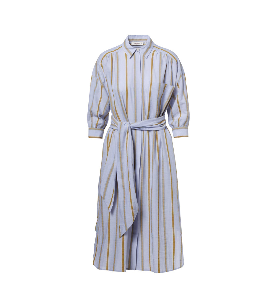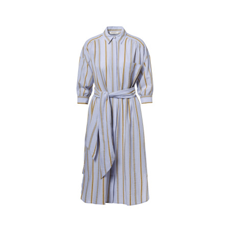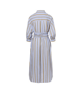 Košeľové šaty INDIA značky Beaumont predstavujú jednoduchý a klasický kúsok v krásnej farebnej kombinácii. "Heavenly blue" je doplnená o pásiky béžovej a hnedo-zelenej. Košeľový strih s golierom, náprsným vreckom a gombíkmi po celej prednej strane zapínania, Vás osloví i rafinovanými gombíkmi umiestnenými po bokoch, čím si viete vytvoriť rázporok podľa vlastnej vôle na ktorejkoľvek strane. Zapínanie goliera je ozvláštnené decentným gombíkom - brošničkou z bielych perličiek v tvare kvetu. Pás si môžete navyše prispôsobiť viazaním opasku v rovnakej farebnej kombinácii. Jemný a ľahký materiál v kombinácii bavlny a ľanu oceníte počas teplých dní.